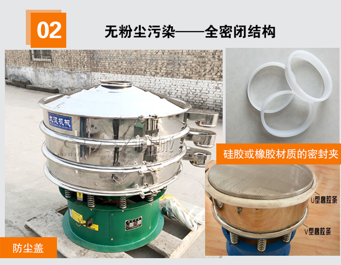在筛分粉状物料时,不少用户抱怨说扬尘大,在购买时用户需要考虑到这一点,所以增加了选购的难度。大汉旋振筛设备采用全密闭结构,外加防尘盖避免在粉状物料筛分过程中出现粉尘飞扬现象,我们厂家的旋振筛采用硅胶或橡胶材质的密封件对筛机进行密封处理,选用德国进口胶水进行加固,可以很大程度上降低粉尘污染。