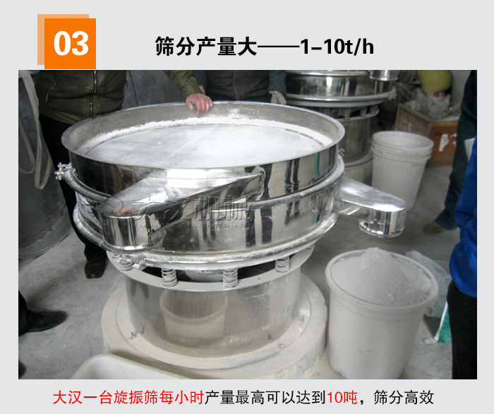 筛分粉类物料时,一般对产量也有所要求,但是考虑到粉状物料的筛分难度,选择普通振动筛可能会造成产能低下等问题,而旋振筛采用法兰电机,动力大,可以增加粉类物料的筛分产量,通过大汉厂家反复在不同的场合对不同物料进行测试,从而得出旋振筛的平均产量,能够完全符合粉状物料的用户筛分要求,大汉一台旋振筛每小时产量高可以达到10吨,筛分高效。
