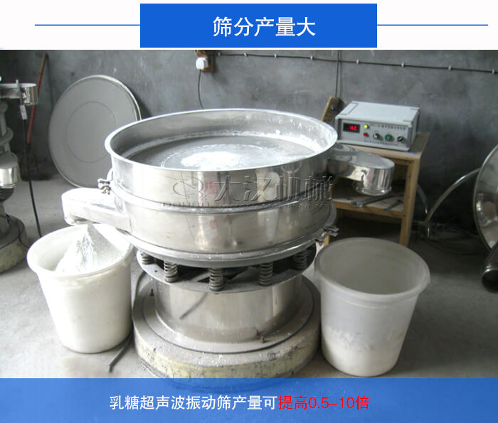 超声波振动筛比不安装超声波的振动筛过网率增加5-20倍,筛分精度可提高1—70%,在保证筛分效果的前提下,乳糖超声波振动筛产量可提高0.5-10倍。