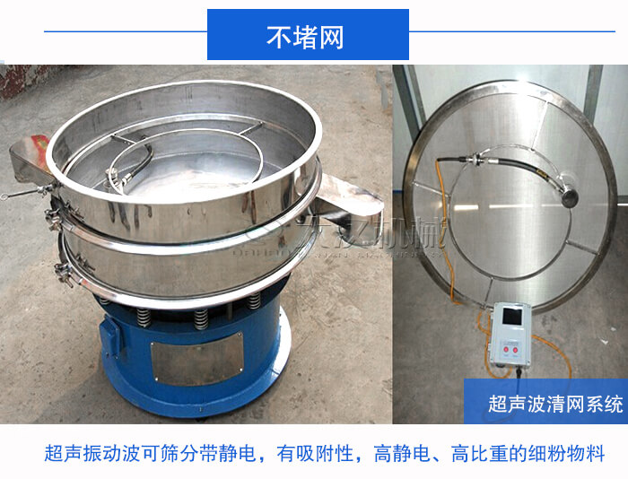 超声波振动筛是在普通旋振筛的基础上举行改良,使用了超声振动波,能够筛分旋振筛不能筛分的细粉物料比如带静电,有吸附性,高静电、高比重的物料,减少乳糖因粘性导致的堵网现象。