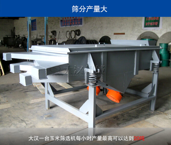 针对玉米筛选行业而言,对我们筛选机的产量是有要求的,大汉生产的玉米筛选机采用双电机驱动,设备激振力大,而且我们的玉米筛选机加装分料器,能有效的利用直线振动筛筛面面积,能使物料均匀分布在筛面上,大大提升物料筛分精度与蝉联,据实验证明,大汉一台玉米筛选机每小时产量高可以达到20吨。