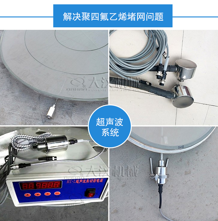 聚四氟乙烯在筛分时由于其物料性质所以会容易出现堵网问题,超声波旋振筛独特的超声波系统可以将可以将220V、50Hz或110V、60Hz电能转化为18KHz的高频电能,输入超声换能器,将其变成18KHz机械振动,加快物料的分离,减少筛上物,可以解决聚四氟乙烯堵网问题。