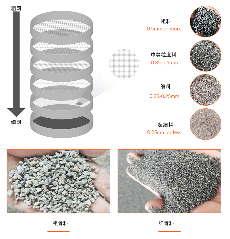 粒度分级:根据筛孔或筛网的大小,物料会被分为不同的粒度级别。较细的颗粒会通过较小的筛孔,而较粗的颗粒会被挡在较大的筛孔上。