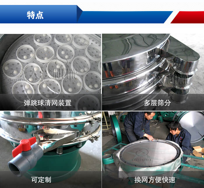 【优势】:①1-5层筛网,可以同时进行2-6个粒度规格的筛分和过滤;②筛分精度可达到500目,加装弹跳球清网装置,筛孔不堵塞,筛分精度高;③可以按照用户要求免费设计。