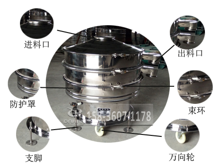 移动式不锈钢旋振筛简介:移动式不锈钢旋振筛底部加装万向轮方便移动,可根据现场的需要安装使用