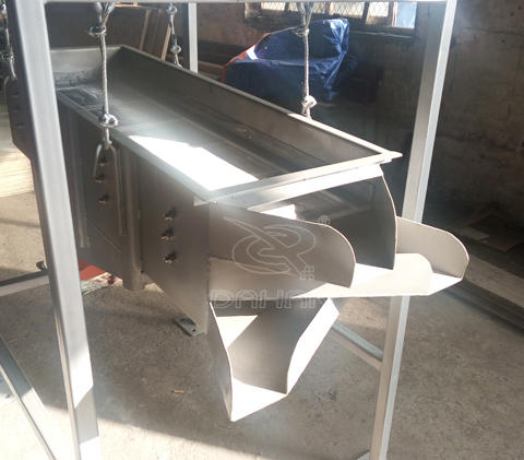吊挂式直线筛物料从给料机均匀地进入筛分机的进料口,在振动电机的激振下,向出料口方向边跳动边筛分。