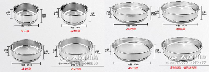 8英寸/12英寸/18英寸标准试验筛:筛网直径分别为8英寸(203mm)、12英寸(304.8mm)和18英寸(457.2mm),可选择不同层数的筛网。