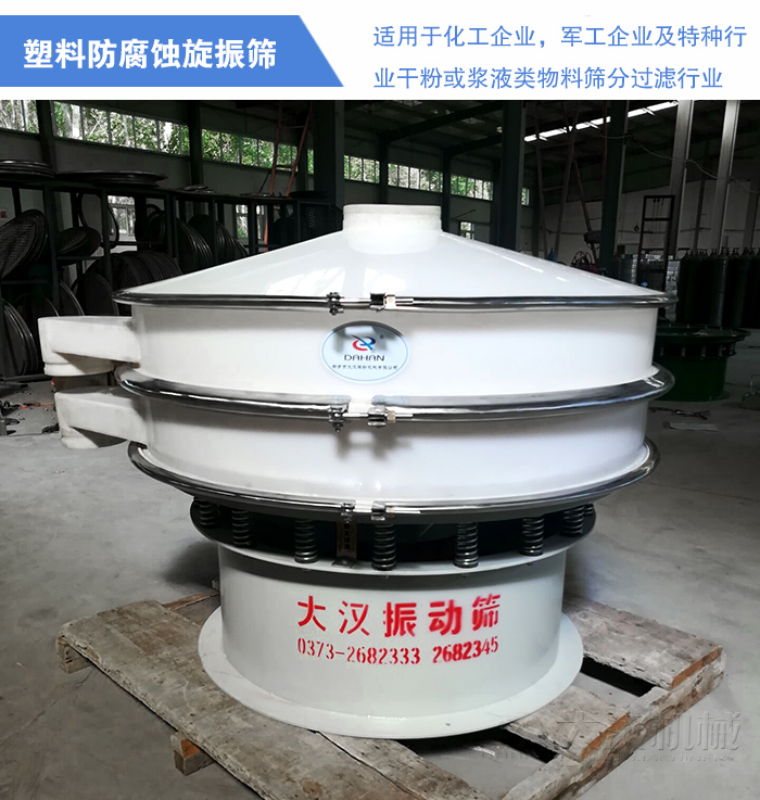 塑料防腐振动筛主要是为了解决筛分时特殊物料与金属接触而产生化学反应及腐蚀性较强等问题。振动筛接触物料部位从筛框、筛网、中框、密封盖和清网装置等完全采用非金属材料,完全排除了一些特殊物料与金属接触会产生化学反应等问题。本机适用于化工企业,军工企业及特种行业干粉或浆液类物料筛分过滤行业。