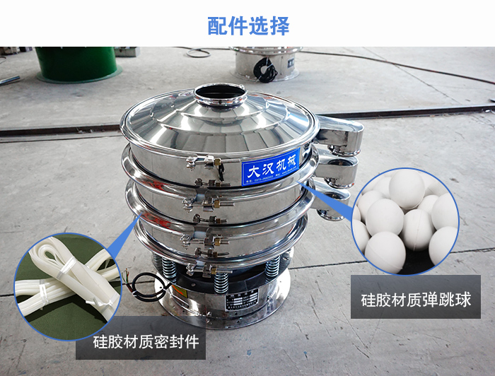 为了配合不锈钢旋振筛筛分的洁净性,要求不锈钢旋振筛的相关配件也需要达到一定的标准,其清网装置-弹跳球和密封装置-密封件要采用食品硅胶材质,以防止对物料造成一定的污染性。