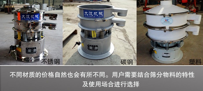 DH-400旋振筛DH-400旋振筛材质有碳钢、不锈钢、塑料等3种,不同材质之间会存在原材料采购费用的不同,所以不同材质的价格自然也会有所不同。用户需要结合筛分物料的特性及使用场合进行选择。
